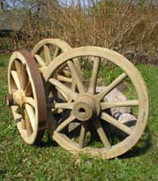 При производстве колес существуют следующие приемы. Сначала колесник заготовляет спицы : берет дубовое бревно и распиливает его на кряжи; затем каждый кряж раскалывает на две или на четыре части, смотря по тому, как велик он в диаметре и эти части сначала обтесывает топором, а потом оскабливает скобелью и при этом на одном конце спицы делает зарубку, чтобы спица плотнее сидела в гнезде. Спицы для передних колес телеги обыкновенно делаются длиной в ½ аршина, а для задних - в 9 вершков.